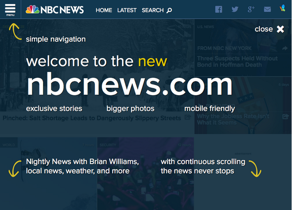 Refonte de NBC News. Avec un splash screen pour expliquer comment fonctionne le site tellement il est "simple".