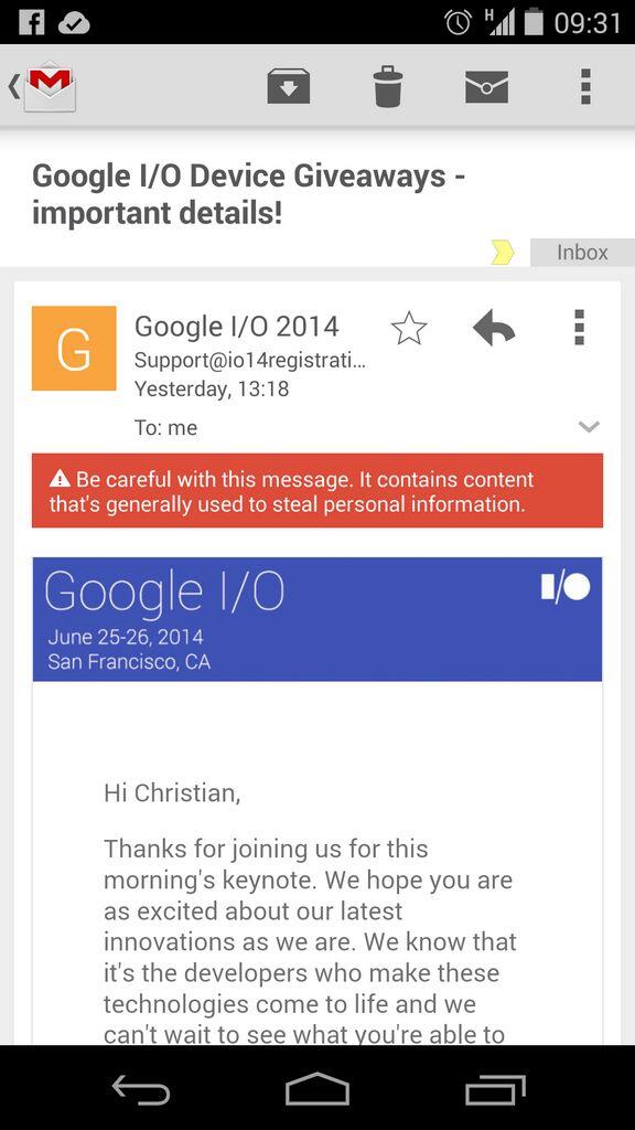 : GMail flags the information mail about setting up the watches as malware. Nicely done. #io14
