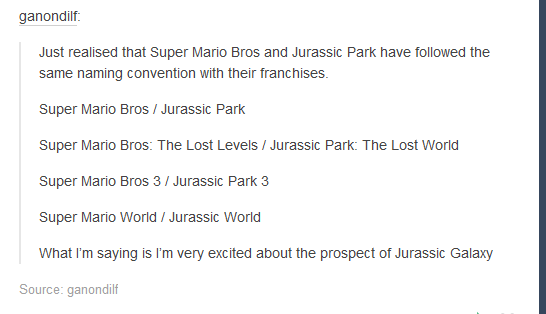 : Super Mario Bros. and Jurassic Park share the same naming conventions. Wow.