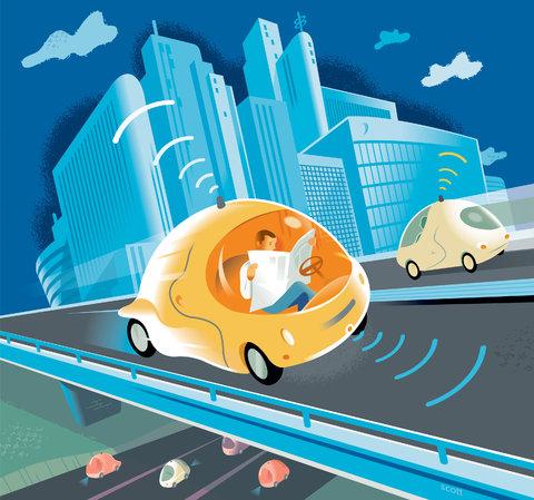 Optimiste, le NYT illustre un type dans une voiture sans conducteur avec un journal papier.
