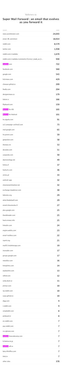 Arrêtez de dire que Medium ça apporte de la visibilité. Sur un article comme Super Mail Forward, Medium c'est à peine de 1,5% des referrers.