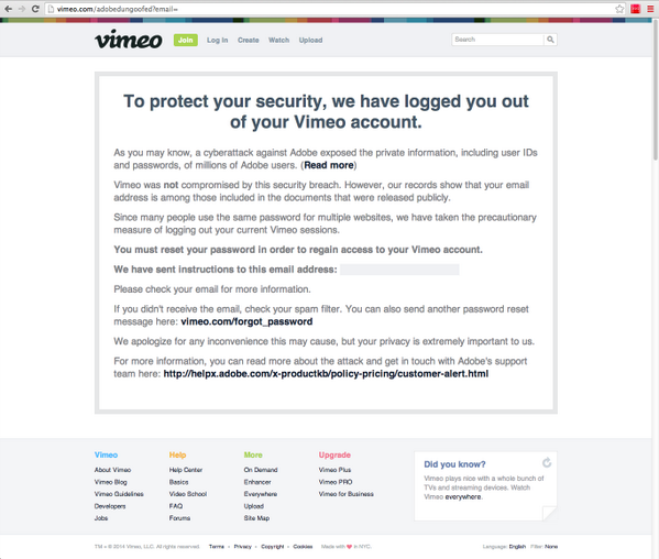 Je me suis connecté sur Vimeo avec une adresse aussi utilisée chez Adobe. J'ai eu ce message. #securitydoneright