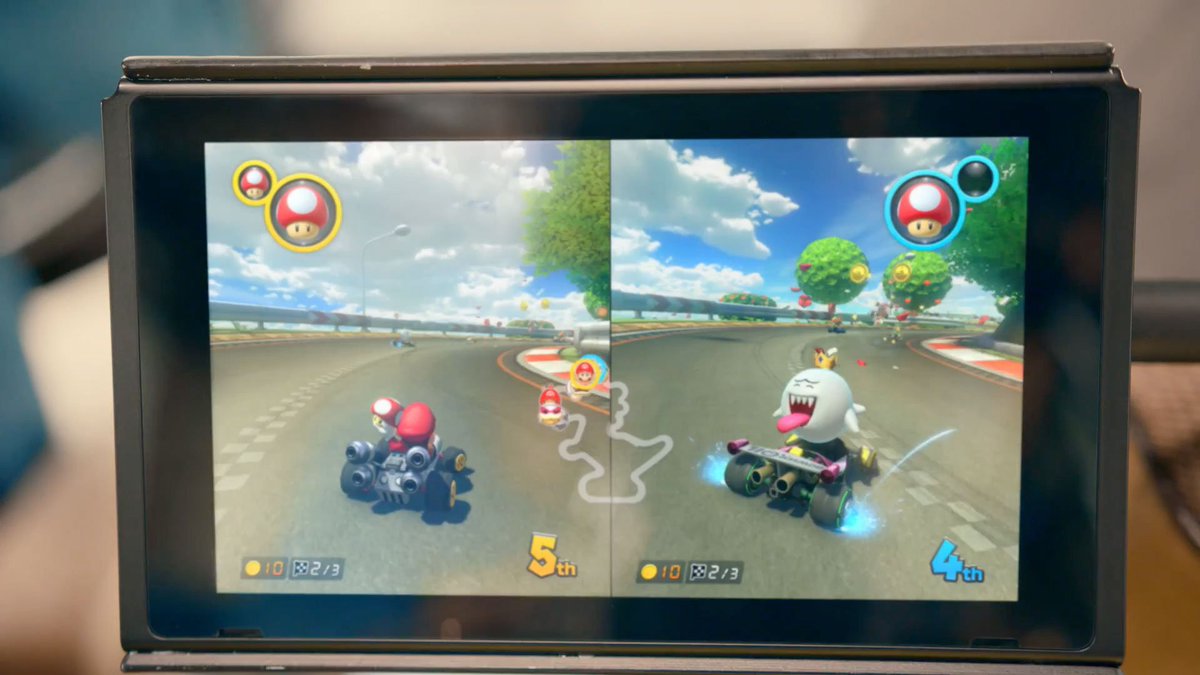 On voit un nouveau perso (King Boo) et on peut garder deux armes (ce qui n'est pas le cas dans Mario Kart 8).